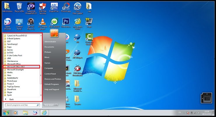 2 คลิก All Programs และเลื่อนหา Microsoft Office 2010
