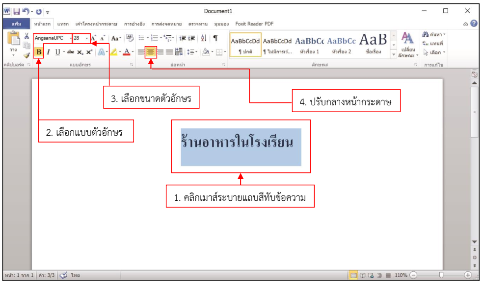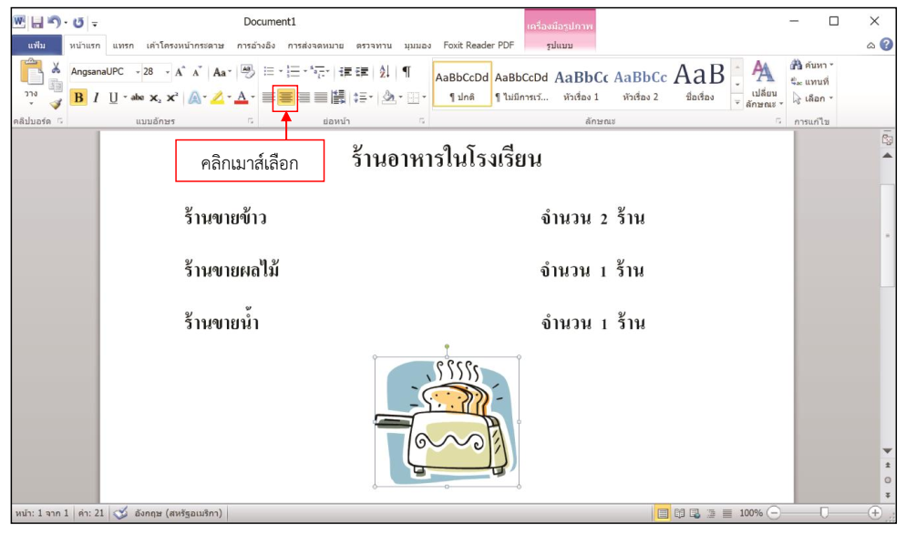 - ปรับตำแหน่งข้อความให้อยู่กลางหน้ากระดาษ