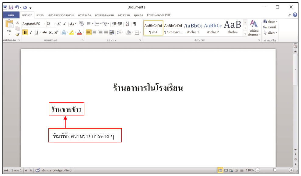 4. พิมพ์ข้อความรายการต่าง ๆ ลงไป เช่น ร้านขายข้าว