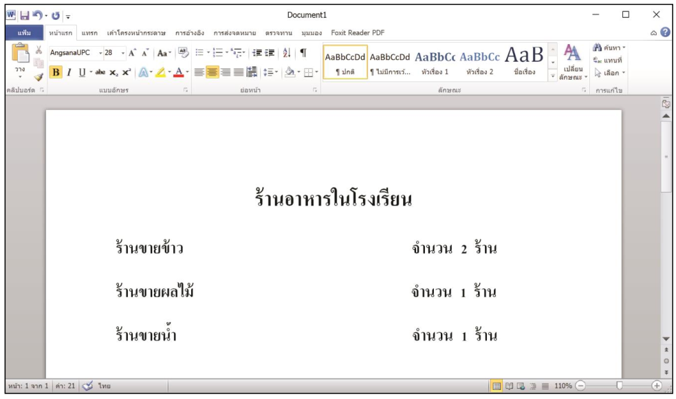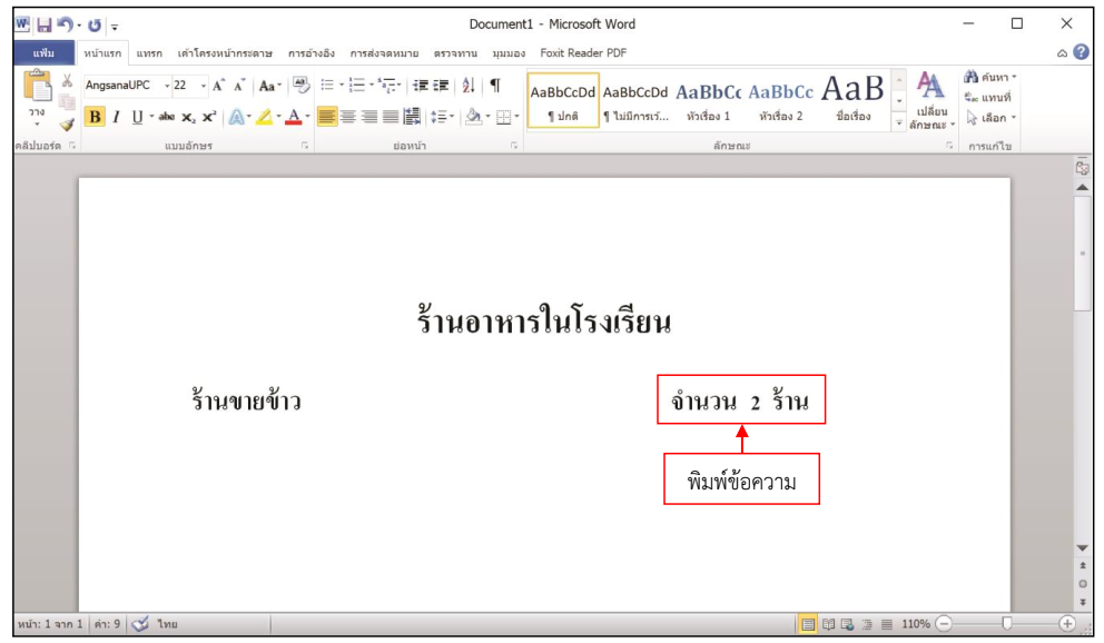 5. กดแป้น Tab ที่คีย์บอร์ด เพื่อเลื่อนตำแหน่งในการพิมพ์ไปยังตำแหน่งที่ต้องการแล้วพิมพ์ข้อความว่า “จำนวน 2 ร้าน”