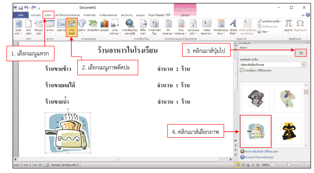 7. แทรกภาพตัดปะ โดยการคลิกเมาส์เลือกเมนู แทรก จากนั้นคลิกเมาส์เลือกเมนู