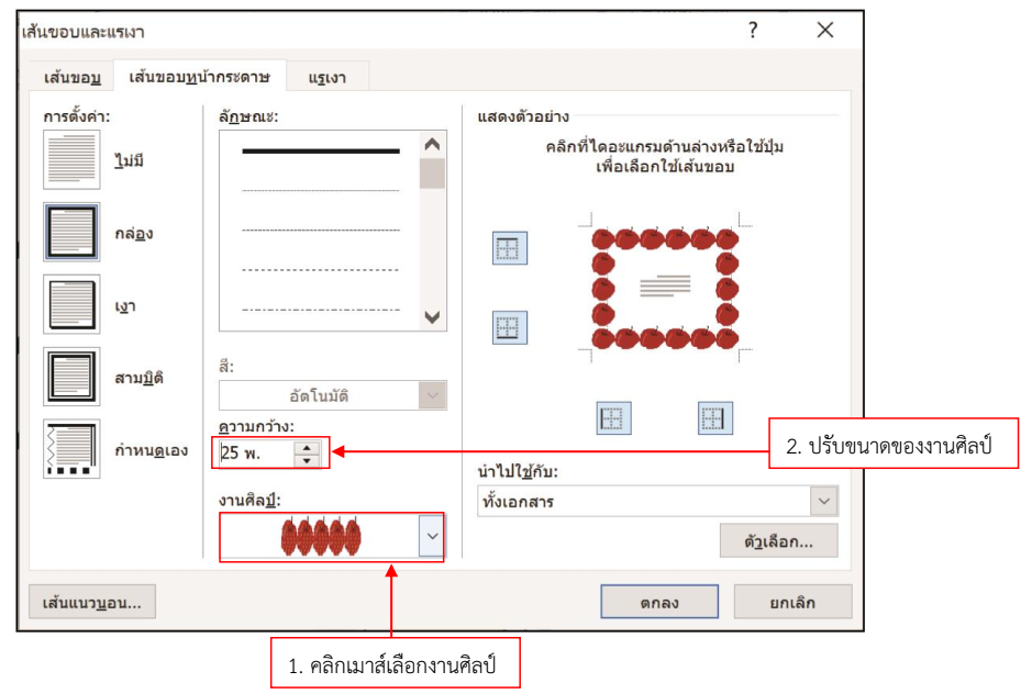 11. ถ้าต้องการงานศิลป์ คลิกเมาส์เลือกรูปแบบงานศิลป์ที่ต้องการ จากนั้นคลิกเมาส์ที่ปุ่ม