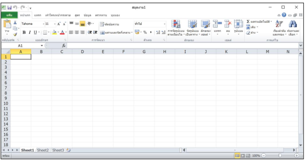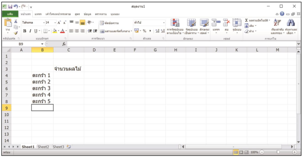 2. เมื่อโปรแกรมแสดงขึ้นมา เราสามารถคลิกเมาส์เลือกเซลล์ต่าง ๆ ที่ต้องการพิมพ์ข้อมูลได้ เช่น คลิกเมาส์เลือกเซลล์ C3 แล้วพิมพ์ข้อความว่า “จำนวนผลไม้”