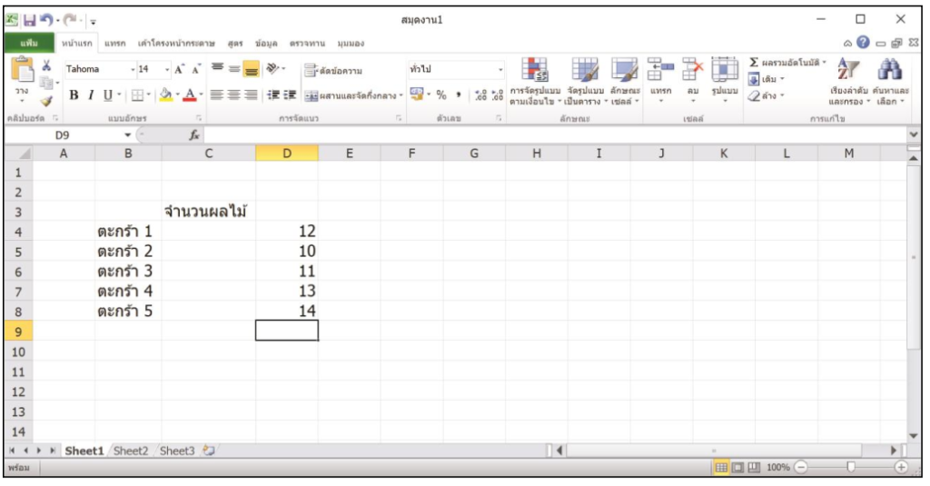 6. พิมพ์จำนวนผลไม้ในตะกร้าต่าง ๆ ลงไปให้ครบลงในเซลล์ D5 ถึง D8 ดังภาพ