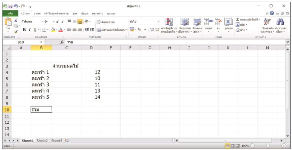 7. คลิกเมาส์เลือกเซลล์ B10 แล้วพิมพ์ข้อความว่า “รวม”