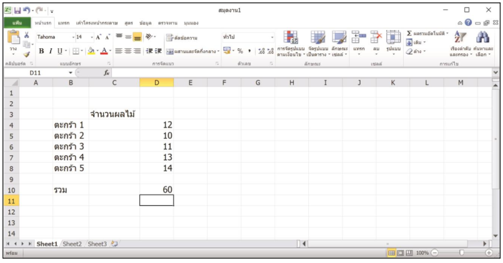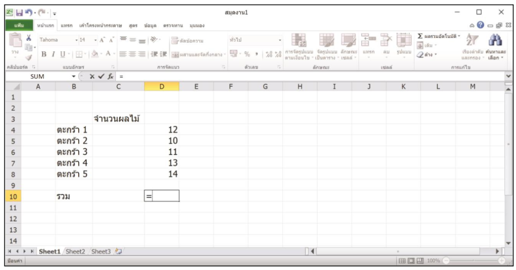 8. คลิกเมาส์ที่เซลล์ D10 สำหรับเก็บผลรวมของจำนวนผลไม้ทั้งหมด เมื่อคลิกเมาส์แล้วให้พิมพ์เครื่องหมาย = เพื่อแสดงการคำนวณ