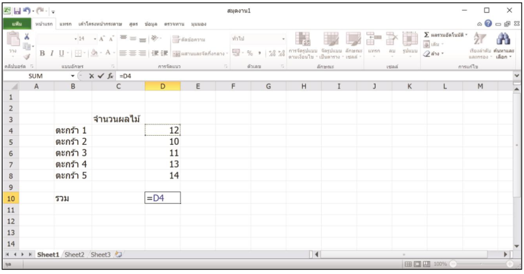 9. คลิกเมาส์เลือกเซลล์ D4 ซึ่งเป็นจำนวนผลไม้ตะกร้าที่ 1