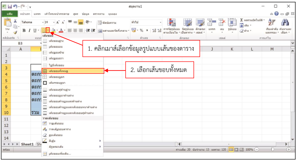 13. คลิกเมาส์เลือกรูปแบบเส้นของตาราง ดังภาพ