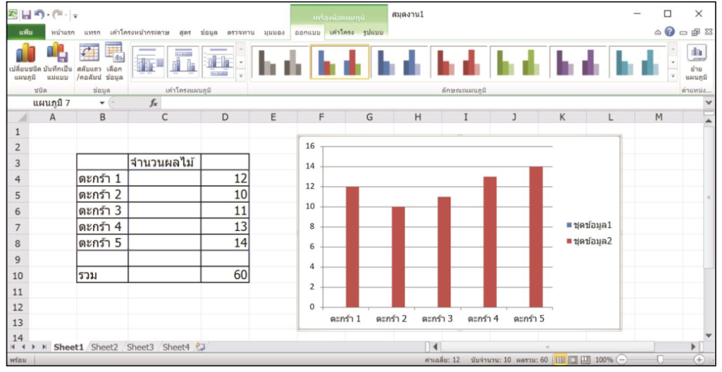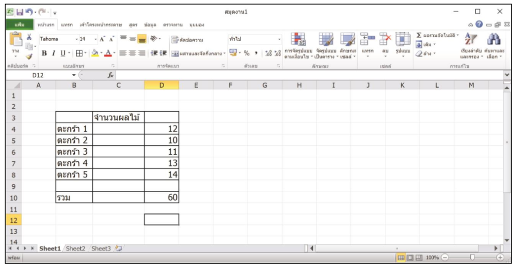 5. คลิกเมาส์เลือกเซลล์ D4 แล้วพิมพ์จำนวนผลไม้ลงไปเป็น 12