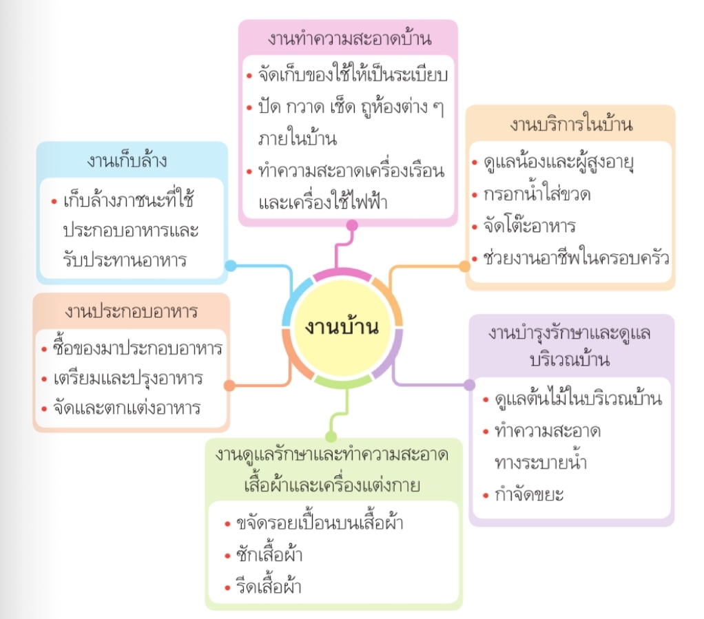 งานบ้านมีทั้งงานทำความสะอาดบ้าน งานบริการในบ้าน งานบำรุงรักษาและดูแลบริเวณบ้าน งานดูแลรักษาและทำความสะอาดเสื้อผ้าและเครื่องแต่งกายงานเก็บล้าง และงานประกอบอาหาร ซึ่งงานเหล่านี้สมาชิกทุกคนในครอบครัวควรช่วยกันทำตามความสามารถของตนเอง