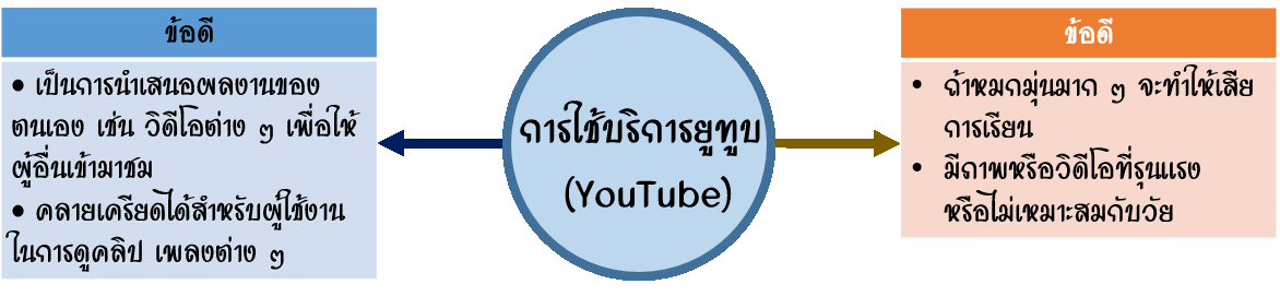 - นักเรียนวิเคราะห์และแสดงความคิดเห็นเกี่ยวกับข้อดีและข้อเสียของบริการยูทูบ (YouTube) เขียนบันทึกคำตอบเป็นแผนภาพความคิด ดังตัวอย่าง