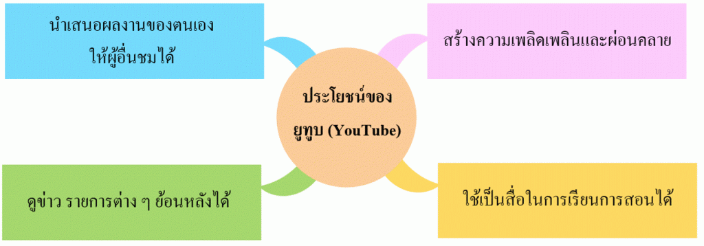 - นักเรียนสรุปเกี่ยวกับประโยชน์ของยูทูบ (YouTube) โดยเขียนบันทึกคำตอบของนักเรียนเป็นแผนภาพความคิดบนกระดาษ ดังตัวอย่าง