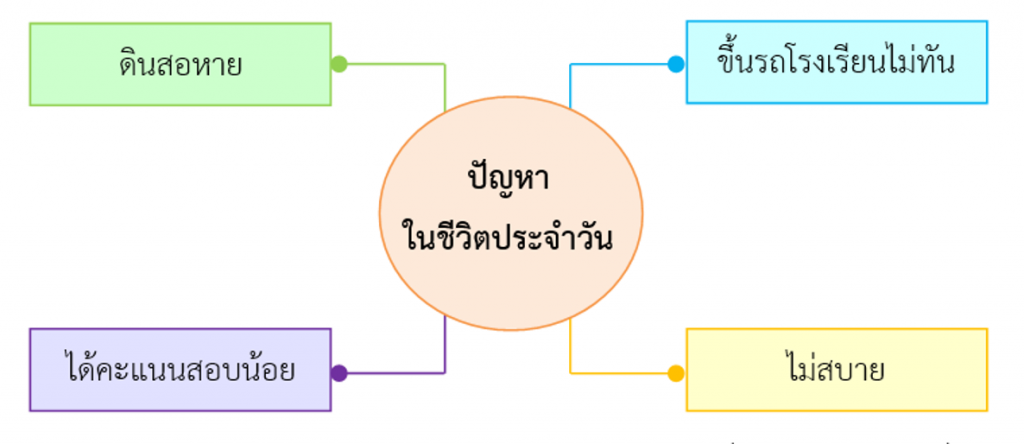 - นักเรียนร่วมกันสนทนาเกี่ยวกับปัญหาในชีวิตประจำวัน แล้วเขียนคำตอบของนักเรียนเป็นแผนภาพความคิดบนกระดาน ดังตัวอย่าง