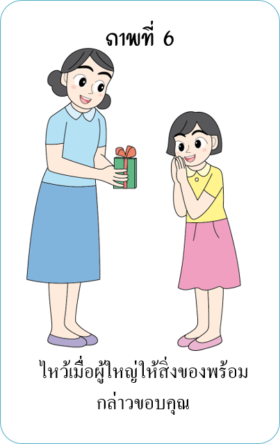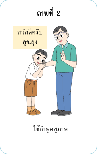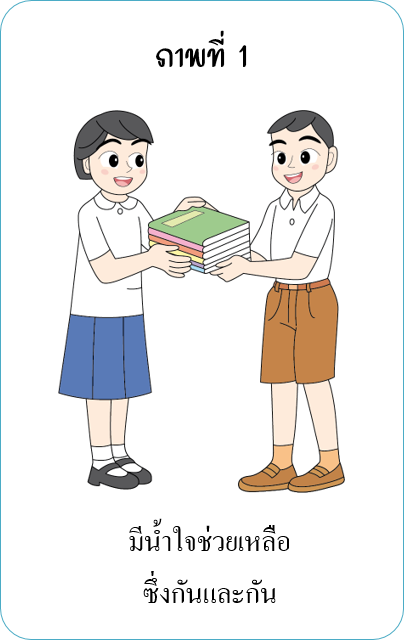 - นักเรียนสังเกตภาพพฤติกรรมต่าง ๆ ร่วมกัน ตัวแทนนักเรียนสุ่มหยิบแถบประโยคพฤติกรรมต่าง ๆ ครั้งละ 1 แถบ จากนั้นนำไปติดไว้ใต้ภาพที่สัมพันธ์กัน จนครบทุกภาพ ดังนี้
