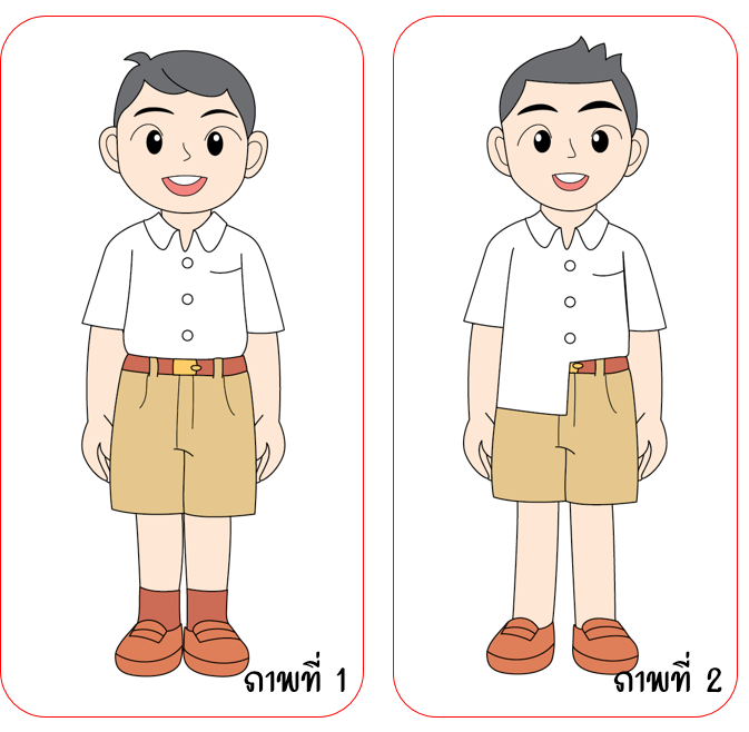 - นักเรียนสังเกตภาพการแต่งกายของนักเรียนชาย 2 คน จากนั้นร่วมกันสนทนา โดยตอบคำถาม ดังนี้