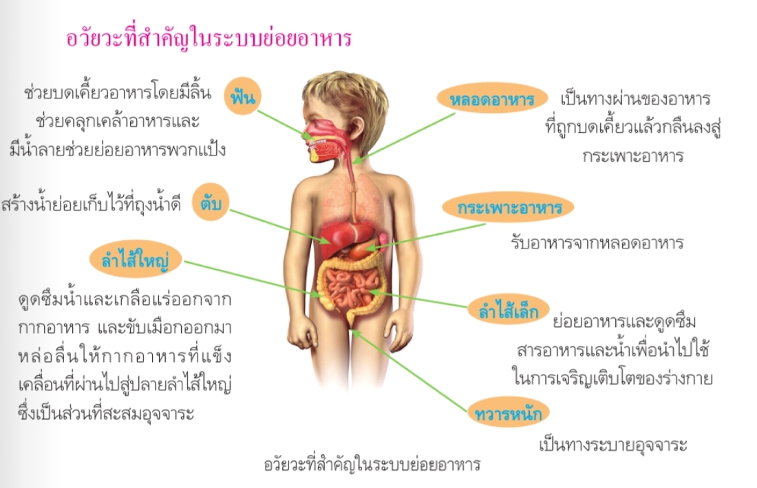 | ลำไส้เล็ก | ย่อยอาหาร และดูดซึมสารอาหาร และน้ำ เพื่อนำไปใช้ในการเจริญเติบโตของร่างกาย |