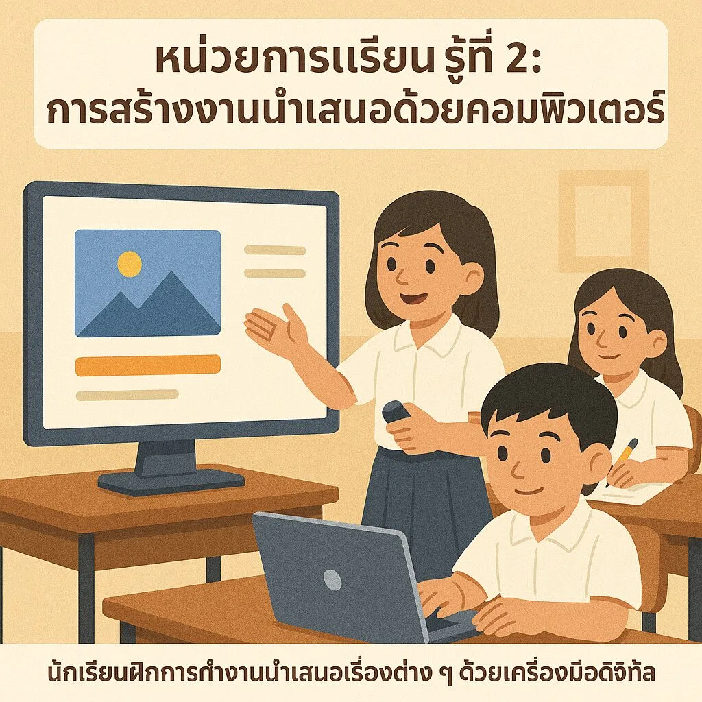 - สร้างผลงานหรือสื่อนำเสนอ ด้วยเครื่องมือดิจิทัล เช่น โปรแกรมนำเสนอ (PowerPoint, Canva) ได้อย่างสร้างสรรค์