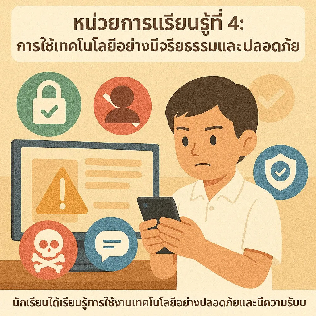- แสดงพฤติกรรมการใช้งานเทคโนโลยีอย่างปลอดภัย มีจริยธรรม และรับผิดชอบต่อตนเองและผู้อื่นในโลกดิจิทัล