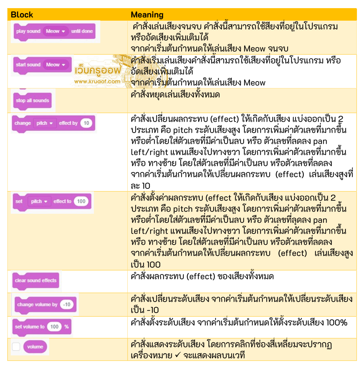 กลุ่มบล็อก Sound (เสียง) เป็นกลุ่มที่ทำงานเกี่ยวกับการแสดงเสียงต่างๆ ของตัวละคร ซึ่งอาจเป็นแหล่งเสียงจากไฟล์ที่มีอยู่ หรือไฟล์เสียงที่บันทึกโดยเครื่องมือบันที่กเสียง (Sound Recorder) ซึ่งอยู่ในโปรแกรม Scratch ไฟล์เสียงจะมีนามสกุล .wav หรือ .mp3 ดังนี้
