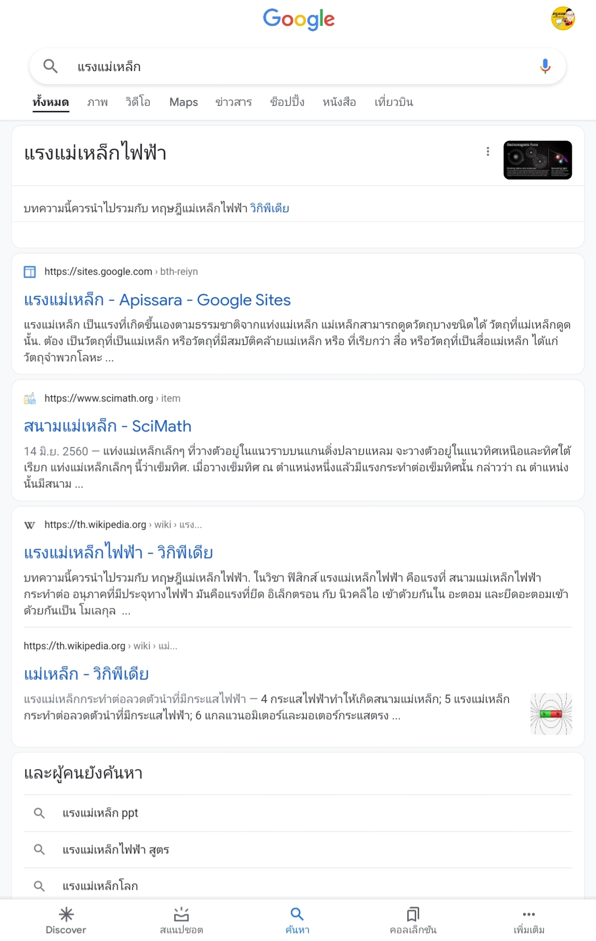 รูปที่ 5 ผลลัพธ์การใช้คำว่า “แรงแม่เหล็ก” ในการค้นหา