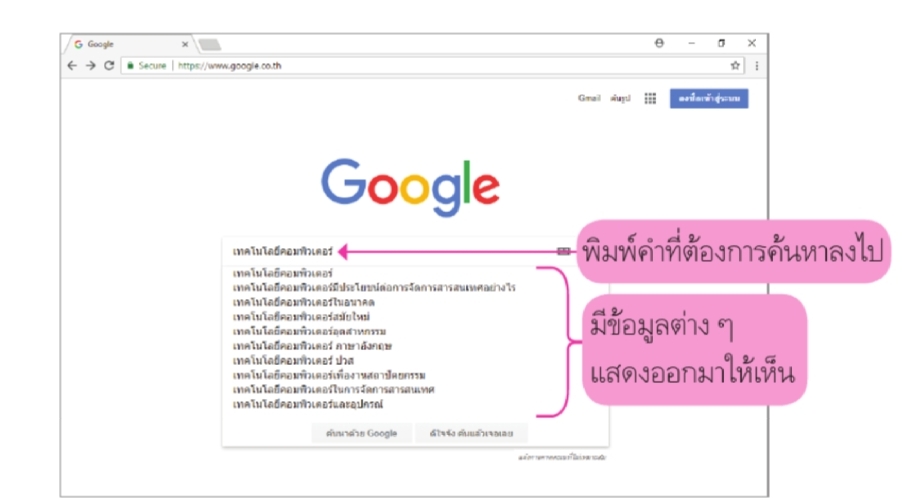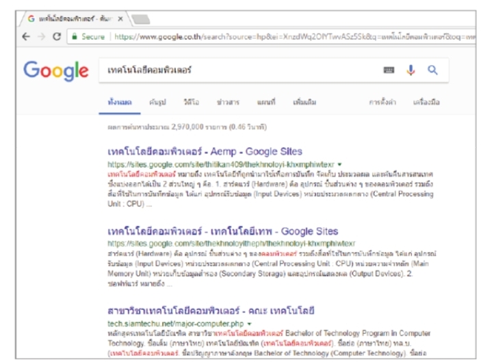 https://www.google.co.th ซึ่งเป็นเว็บไซต์ที่มีคำสั่งต่างๆ เป็นภาษาไทย ในการใช้งานเพียงพิมพ์ข้อความหรือคำที่ต้องการค้นหาลงไปในพื้นที่สำหรับพิมพ์คำสืบค้นข้อมูล ก็จะมีข้อมูลปรากฏให้เห็น เช่น ต้องการค้นหาด้วยคำว่า “เทคโนโลยีคอมพิวเตอร์