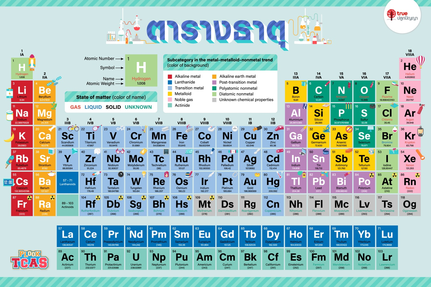 - ตัวเลขด้านล่าง คือ มวลอะตอม (Atomic Mass) หรือจำนวนโปรตอนและนิวตรอนภายในนิวเคลียสของธาตุนั้นๆ