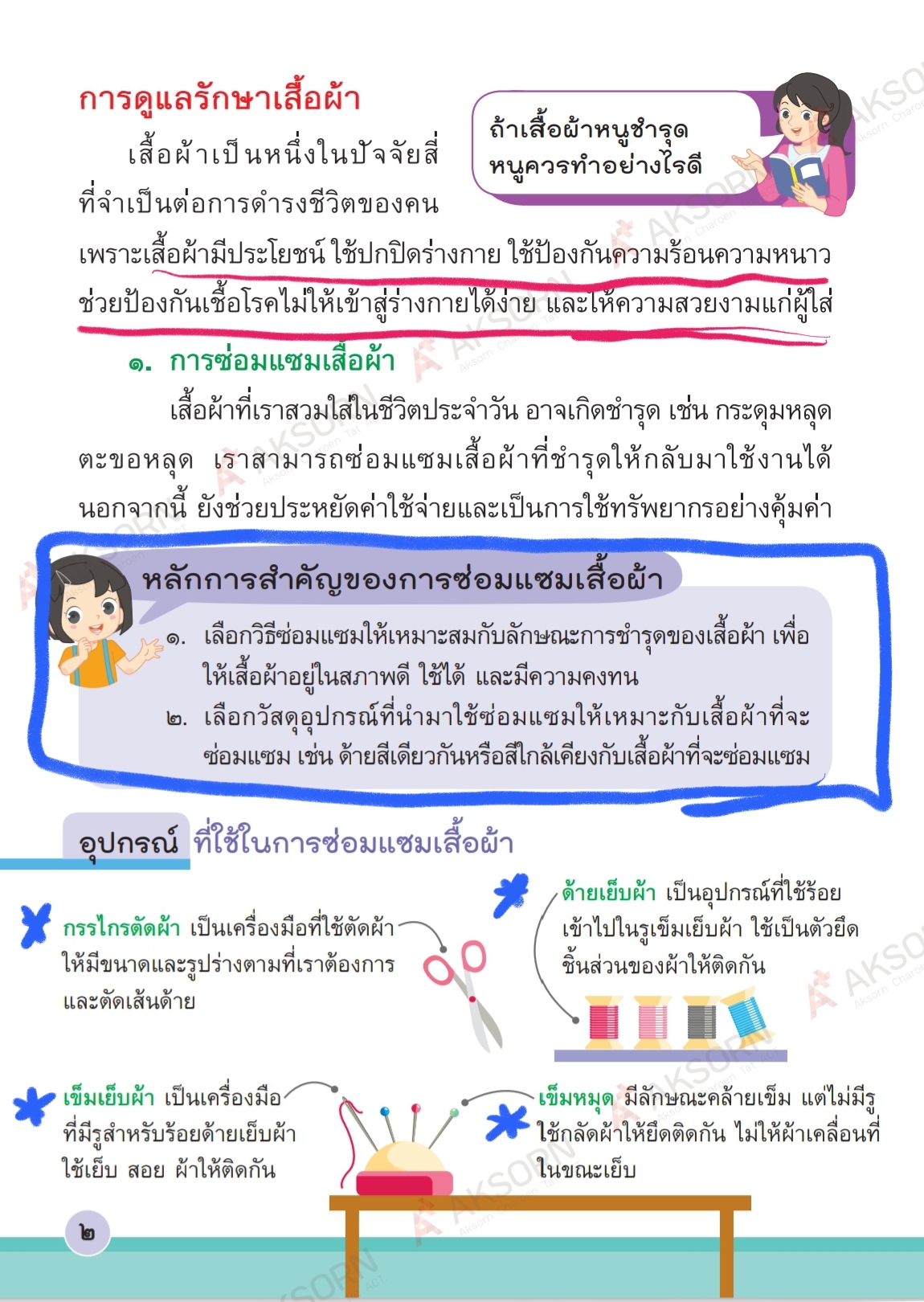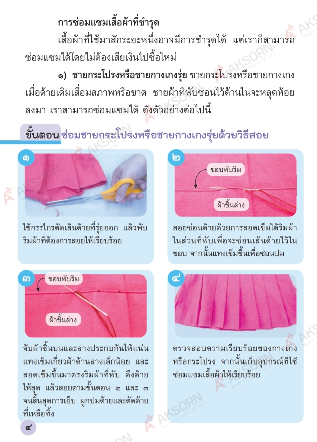 ตรวจสอบการชํารุด ถ้าเสื้อผ้าชํารุดเล็กน้อยให้ซ่อมแซมด้วยวิธีการเย็บด้วยมือเบื้องต้น ถ้าเสื้อผ้าชํารุดเสียหายมากควรนําไปให้ผู้ปกครองช่วยซ่อมแซม