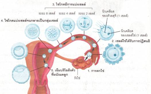 การปฏิสนธิของตัวอสุจิและไข่ของมนุษย์ เกิดบริเวณท่อนำไข่ หรือปีกมดลูก เกิดเป็นเซลล์ใหม่ 1 เซลล์ที่เรียกว่า ไซโกต ไซโกตมีการแบ่งเซลล์จาก 1 เซลล์ เป็น 2 เซลล์ และทวีคูณเรื่อย ๆ จนเกิดกลุ่มเซลล์ ระหว่างแบ่งเซลล์กลุ่มเซลล์เคลื่อนไปตามท่อนำไข่ แล้วฝังตัวที่ผนังมดลูก เรียกกลุ่มเซลล์ในระยะนี้ว่า เอ็มบริโอ