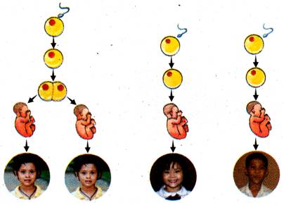 ในบางกรณี เมื่อตัวอสุจิเข้าไปผสมกับไข่ได้เป็นไซโกตแล้ว เซลล์ไซโกตอาจแยกออกเป็น 2 เซลล์ แต่ละเซลล์จะเจริญพัฒนาไปเป็นเอ็มบริโออยู่ภายในครรภ์ของแม่ ซึ่งทารกที่เกิดจากไซโกตเดียวกัน จะมีเพศเดียวกัน และลักษณะพันธุกรรมเหมือนกัน ทุกประการ เรียกฝากแฝดลักษณะนี้ว่า แฝดร่วมไข่ หรือ แฝดแท้