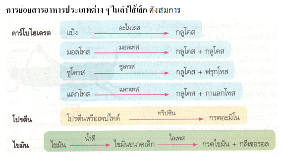 การย่อยในลำไส้เล็ก ต้องอาศัยเอนไซม์จากตับอ่อน ซึ่งประกอบด้วยเอนไซม์ ต่าง ๆ ดังนี้