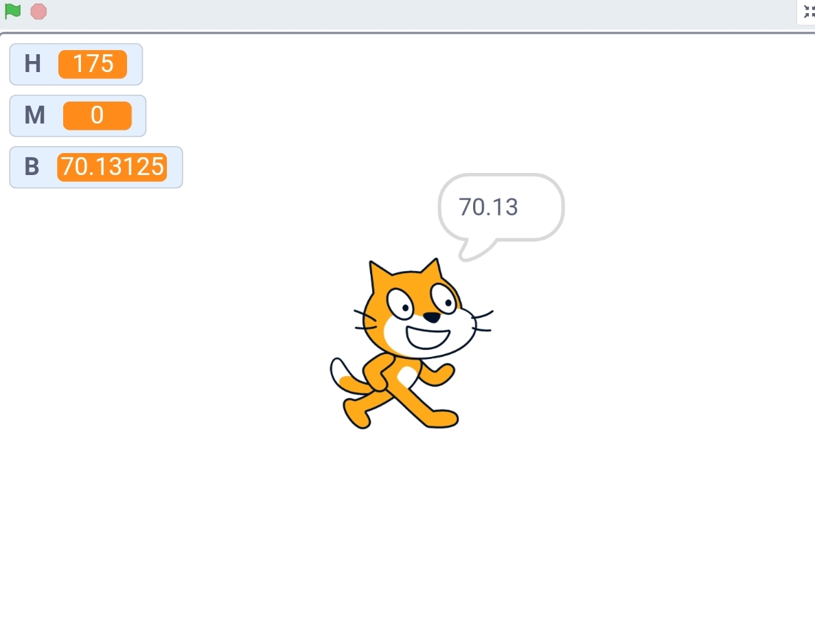 - ทดลองรันโปรแกรม จะพบว่าแมวจะแสดงข้อความว่า “คุณสูงเท่าไร” จากนั้นทดลองป้อนค่า 175 ลงไป จะพบว่าโปรแกรมจะแจ้งว่าน้ำหนักที่เหมาะสมคือ 70.13 ดังภาพ
