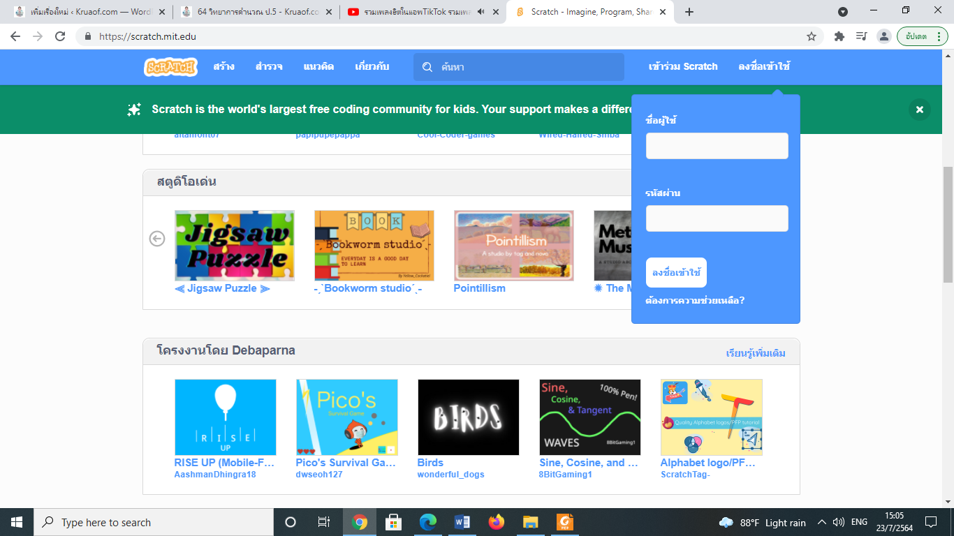 - จากภาพเป็นการเข้าใช้งานโปรแกรม Scratch อย่างไร