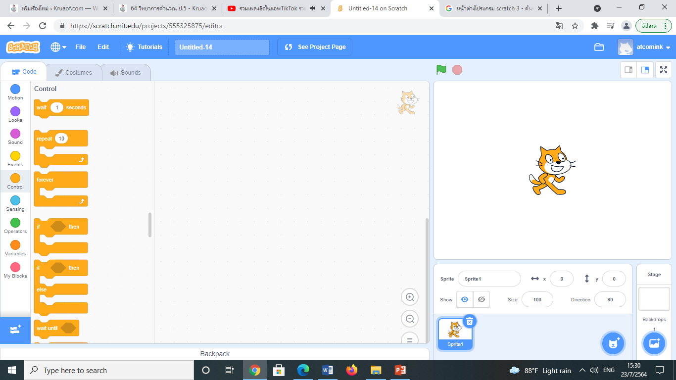 - ถ้าคลิกเมาส์เลือกกลุ่มคำสั่งควบคุม โปรแกรมจะแสดงคำสั่งควบคุมออกมา ซึ่งใช้ควบคุมการทำงานของโปรแกรมและตัวละคร เช่น ให้ทำงานเมื่อมีการคลิกเมาส์ให้ทำงานซ้ำ ๆ ให้หน่วงเวลารอดังภาพ