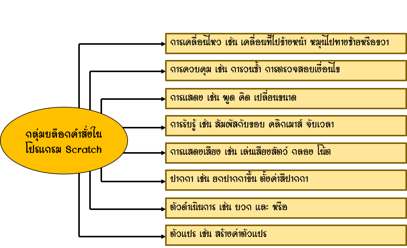 - นักเรียนวิเคราะห์เกี่ยวกับกลุ่มบล็อกคำสั่งในโปรแกรม Scratch โดยเขียนบันทึกคำตอบของนักเรียนเป็นแผนภาพความคิด
