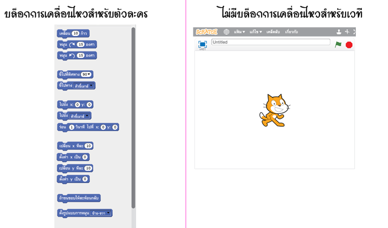 - เพราะเหตุใดภาพด้านซ้ายมือจึงมีบล็อกคำสั่งการเคลื่อนไหวของตัวละครและภาพด้านขวามือจึงไม่มี