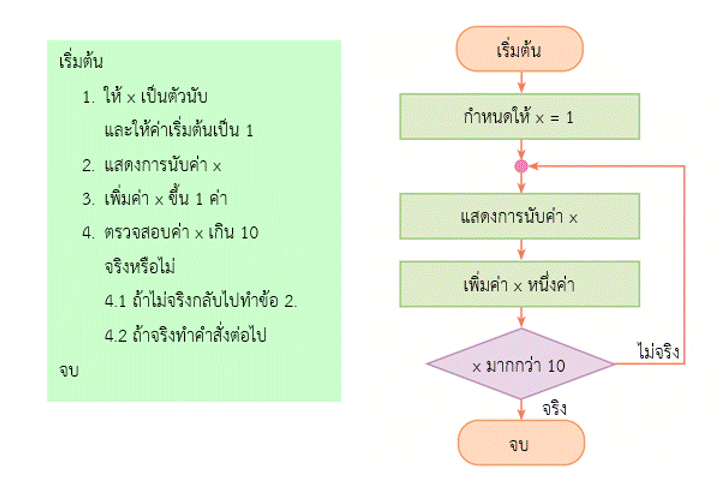 การเขียนโปรแกรมนับเลข 1 ถึง 10 เราจะเริ่มนับค่า 1 ก่อน จากนั้นเพิ่มค่าขึ้นครั้งละ 1 ค่า แล้วกลับมานับซ้ำ โดยการนับซ้ำแต่ละครั้งจะตรวจสอบว่าค่าที่นับได้เกิน 10 จริงหรือไม่ ถ้าจริงให้หยุดนับและจบการทำงาน