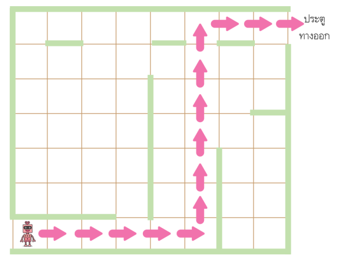 ปฏิบัติกิจกรรม พาหุ่นยนต์ออกจากเขาวงกต แล้วคิดแก้ปัญหาโดยเขียนลูกศรจากตำแหน่งเริ่มต้นไปยังตำแหน่งประตูทางออกว่าจะทำอย่างไรให้หุ่นยนต์เดินโดยผ่านจำนวนบล็อกน้อยที่สุด แล้วแสดงขั้นตอนการทำงานของหุ่นยนต์เป็นอัลกอริทึม ดังตัวอย่าง