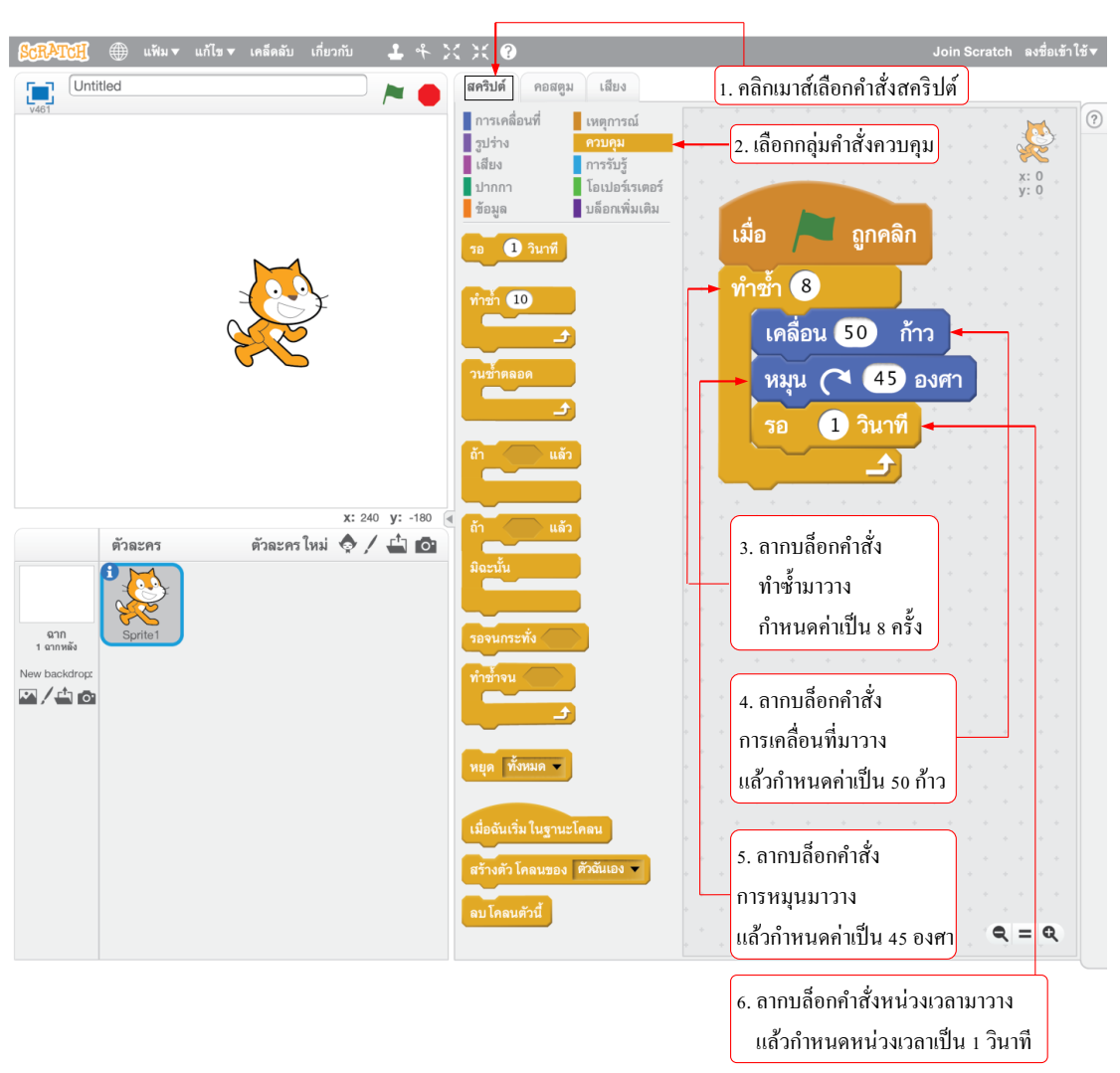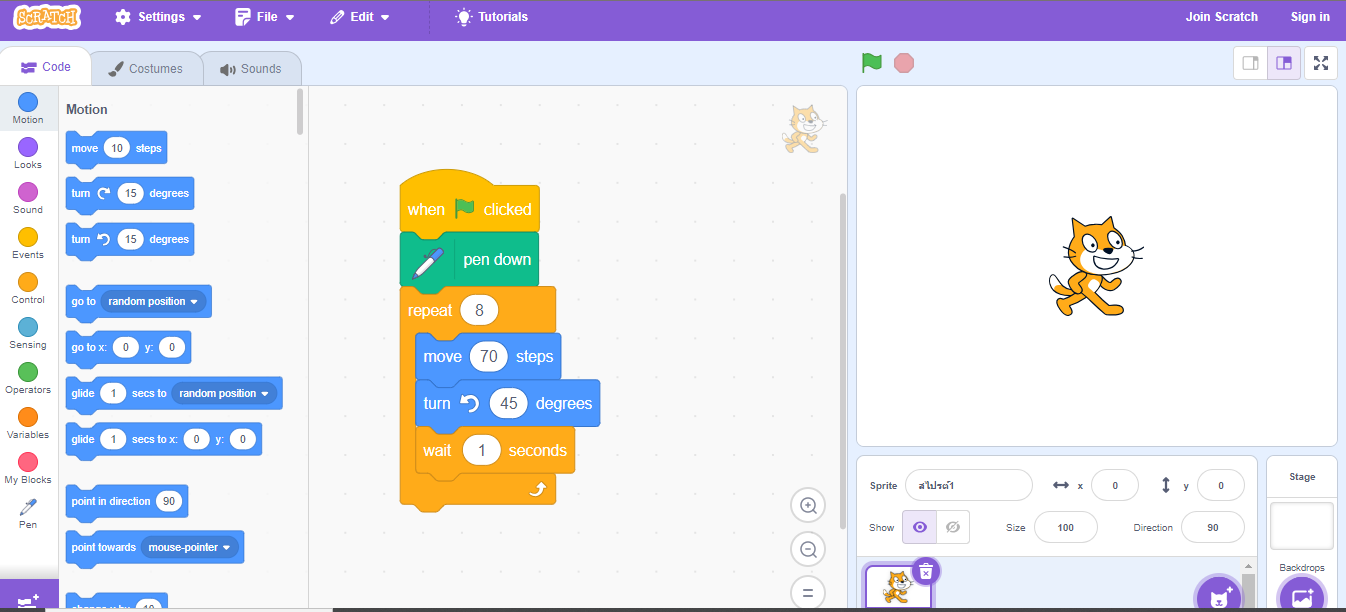 การเขียนโปรแกรม Scratch ให้แมวเดินลากเส้นเป็นรูปแปดเหลี่ยม