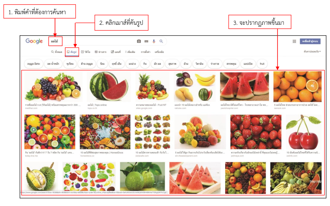 1. เปิดเว็บไซต์ของภาพที่ต้องการ เช่น ใช้คำค้นว่า “ผลไม้” แล้วเลือกภาพ