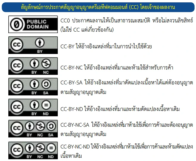 - CC BY-ND: อนุญาตให้ใช้และแจกจ่ายได้ แต่ห้ามดัดแปลง และต้องระบุชื่อผู้สร้าง