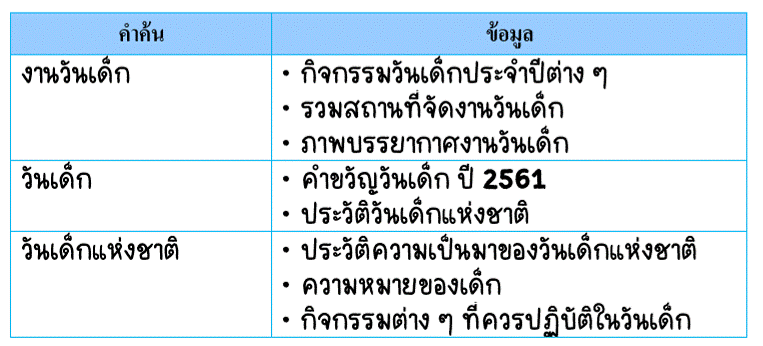 - นักเรียนปฏิบัติกิจกรรมที่ 2.2 ฉลาดค้นบนอินเทอร์เน็ต โดยนักเรียนค้นหาข้อมูลและภาพที่เกี่ยวกับงานวันเด็กบนอินเทอร์เน็ต โดยใช้คำค้นหลาย ๆ คำ แล้วเปรียบเทียบข้อมูลที่ได้เขียนบันทึกลงในตาราง ดังตัวอย่าง
