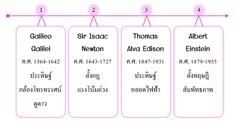 - นักเรียนค้นหาชื่อนักวิทยาศาสตร์และผลงานที่นักเรียนรู้จักมา 4 คน จากนั้นนำชื่อนักวิทยาศาสตร์ มาเขียนเรียงลำดับตามช่วงเวลาของแต่ละคน บันทึกลงในแผนภาพความคิด ดังตัวอย่าง