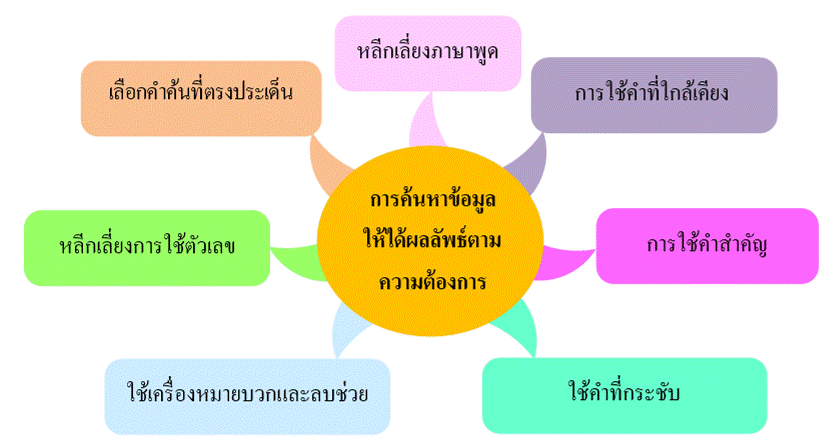 - นักเรียนวิเคราะห์และแสดงความคิดเห็นเกี่ยวกับการค้นหาข้อมูลให้ได้ผลลัพธ์ตามต้องการควรมีลักษณะอย่างไร โดยเขียนบันทึกคำตอบของนักเรียนเป็นแผนภาพความคิดบนกระดาน ดังตัวอย่าง