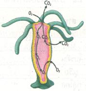 ไฮดราไม่มีอวัยวะที่ใช้ในการหายใจ แก๊สออกซิเจนที่ละลายในน้ำแพร่เข้าสู่เซลล์ แก๊สคาร์บอนไดออกไซด์ก็แพร่ออกจากเซลล์ ดังภาพ