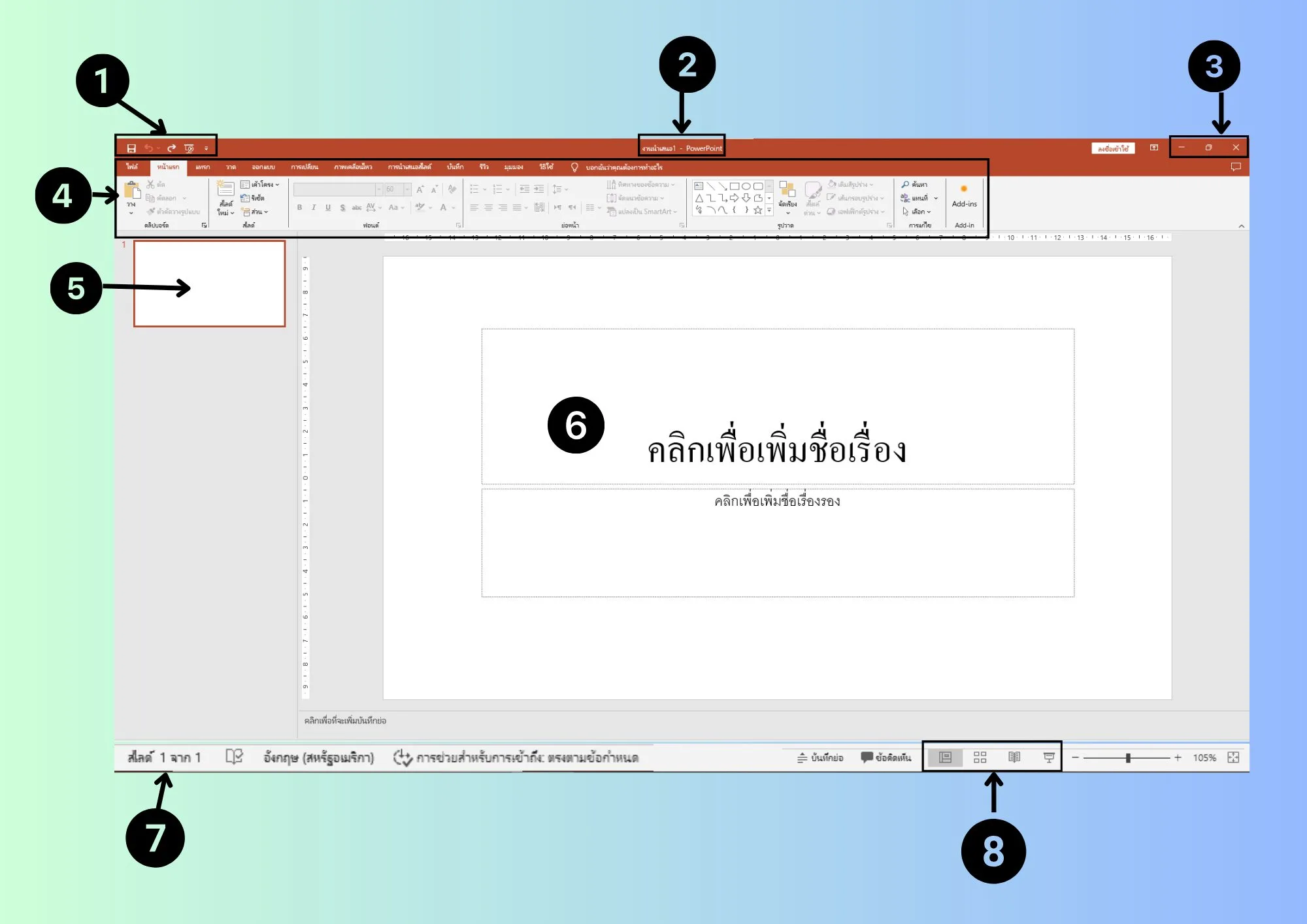 - แถบสถานะ (Status Bar): แสดงข้อมูลเกี่ยวกับสไลด์