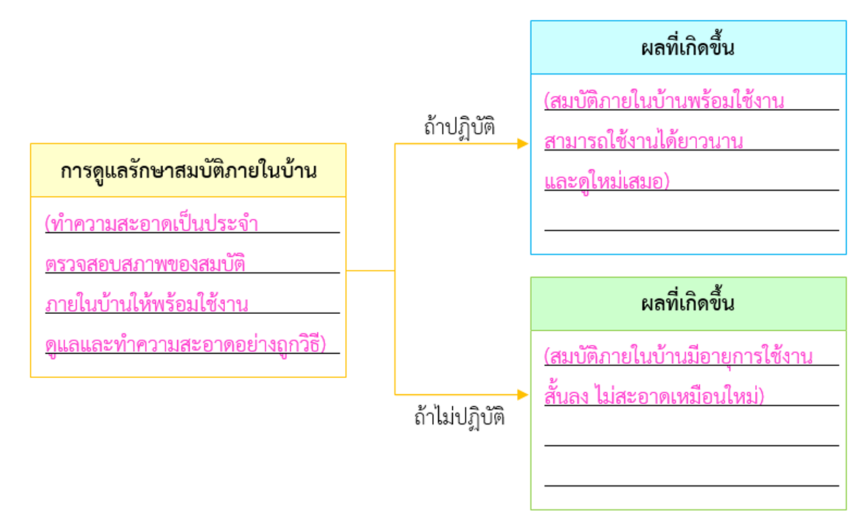 - นักเรียนแต่ละกลุ่มร่วมกันวิเคราะห์เกี่ยวกับการดูแลรักษาสมบัติภายในบ้าน ผลที่เกิดขึ้นเมื่อปฏิบัติและไม่ปฏิบัติ บันทึกลงในแผนภาพความคิด ดังตัวอย่าง