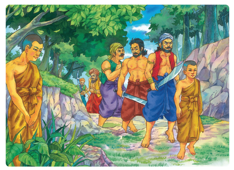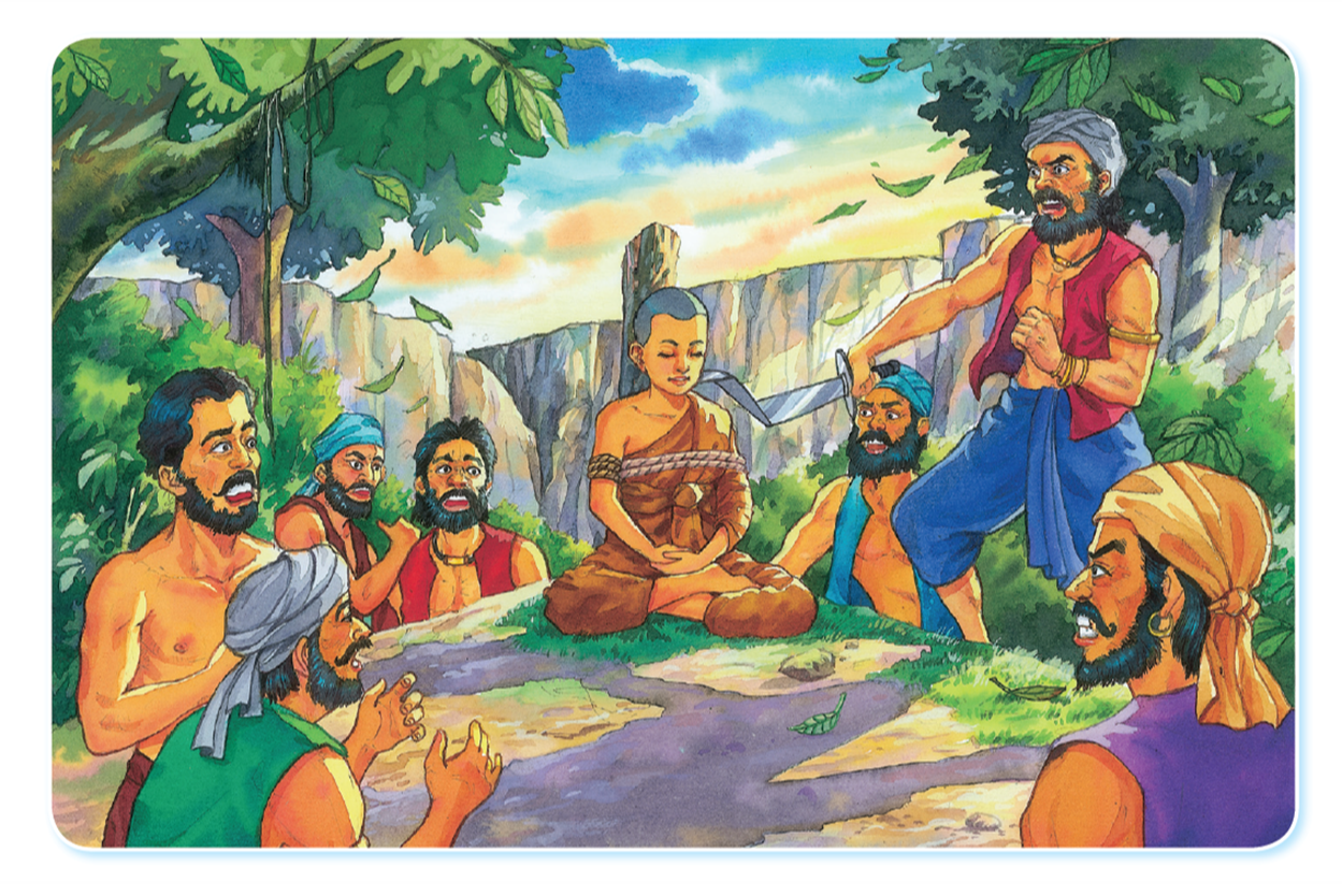 ชายยากไร้เดินเข้าไปในป่าที่มีโจร ๕๐๐ คนอยู่ ในขณะนั้นโจรได้เตรียมบนบานเทวดาว่าจะถวายพลีกรรม (อ่านว่า พะ-ลี-กำ หมายถึง การบูชา พิธีบูชา) เมื่อชายยากไร้เดินมาถึง ก็ถูกโจรจับตัวไว้ เขาตกใจกลัวตายจึงได้ร้องขอชีวิตและต่อรองว่า “ควรจับพระภิกษุมาทำพลีกรรมจะดีกว่าเพราะเป็นผู้ทรงศีล เทวดาท่านจึงจะชอบ” โจรทั้งหมดเห็นด้วยจึงบอกให้ชายยากไร้นำทางไปหาพระสงฆ์ เมื่อไปถึงเขาได้ตีระฆัง พระสงฆ์จึงมารวมกันเพราะเข้าใจว่า มีพระสงฆ์อาพาธ (ป่วย) หัวหน้าโจรจึงบอกว่าจะนำตัวพระสงฆ์รูปหนึ่งไปทำพลีกรรม พระสังฆเถระจึงขอสละชีวิต พระสงฆ์ที่เหลือไม่ยอมให้พระสังฆเถระไป ต่างยอมสละชีวิตของตนเองแทน