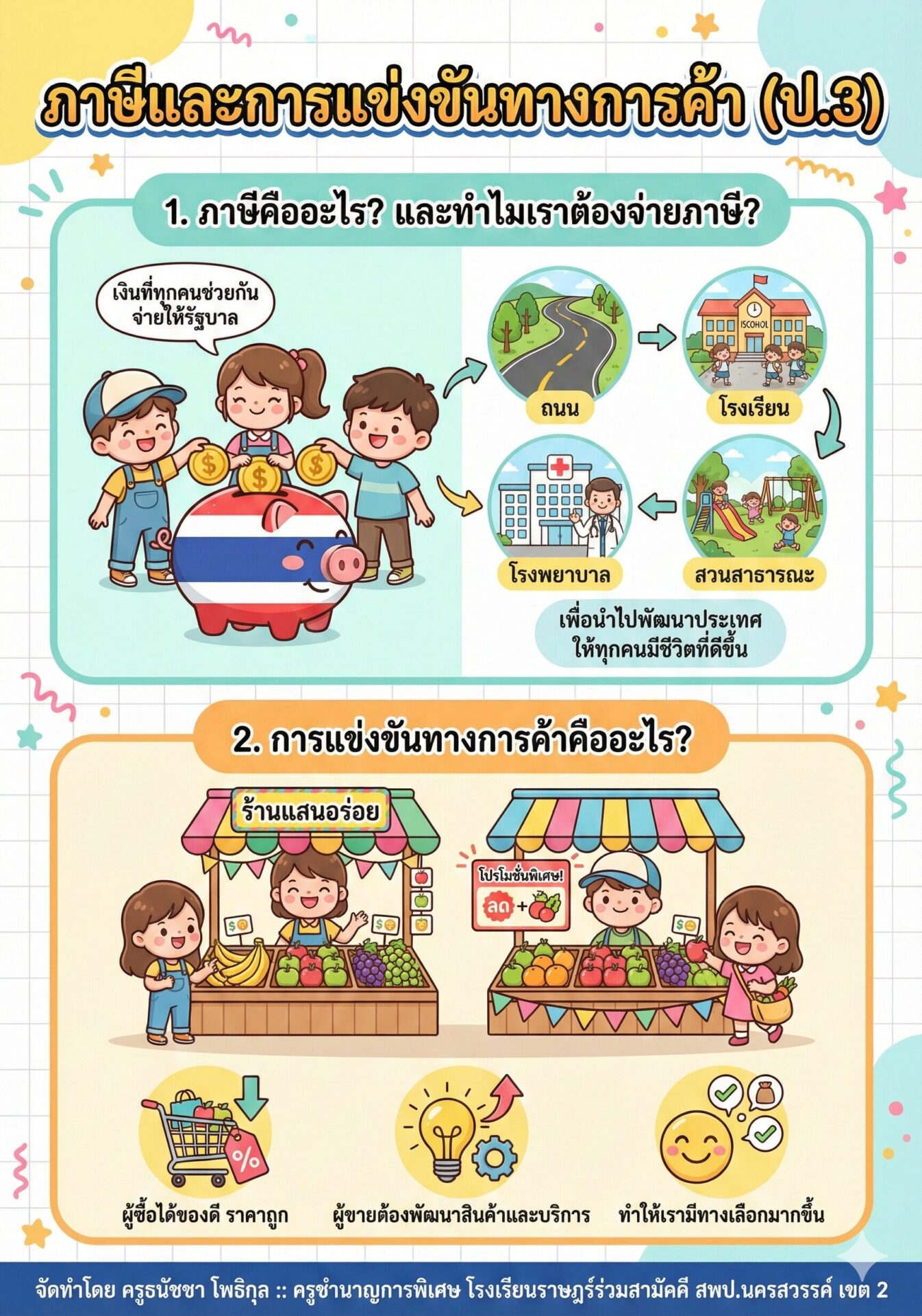 → เพื่อนำไปสร้างถนน โรงเรียน โรงพยาบาล และบริการต่าง ๆ - การแข่งขันทางการค้า = ร้านค้าหลายร้านขายของแบบเดียวกัน แข่งกันดึงดูดลูกค้า