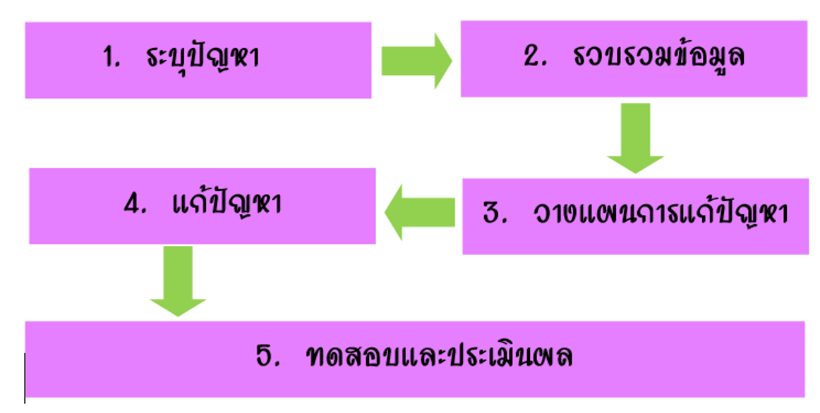 ขั้นตอนการแก้ปัญหาเป็นหลักการแก้ปัญหาอย่างมีประสิทธิภาพและให้ผลลัพธ์ที่ดี ซึ่งประกอบด้วย  ระบุปัญหา รวบรวมข้อมูล วางแผนการแก้ปัญหา แก้ปัญหา ทดสอบและประเมินผล