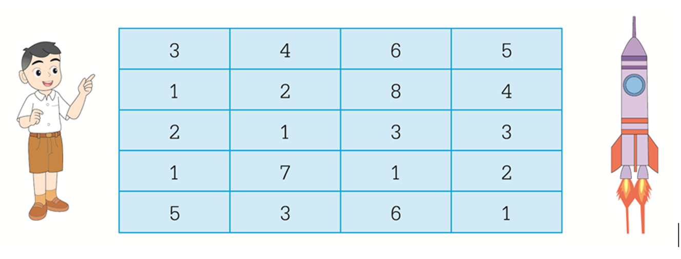 เด็กคนหนึ่งจะเดินทางผ่านด่านไปขึ้นจรวดที่อยู่อีกด้านหนึ่ง แต่การเดินทางนั้นจะต้องเสีย ค่าใช้จ่ายตามที่กำหนดในตาราง นักเรียนจะหาเส้นทางที่พาเด็กเดินผ่านไปได้อย่างไรโดยให้เสีย ค่าใช้จ่ายน้อยที่สุด และการเดินทางนั้นจะต้องเดินทางขึ้นหรือลง ไปทางซ้ายหรือขวา ไม่สามารถเดินทางในแนวทแยงหรือแนวเฉียงได้